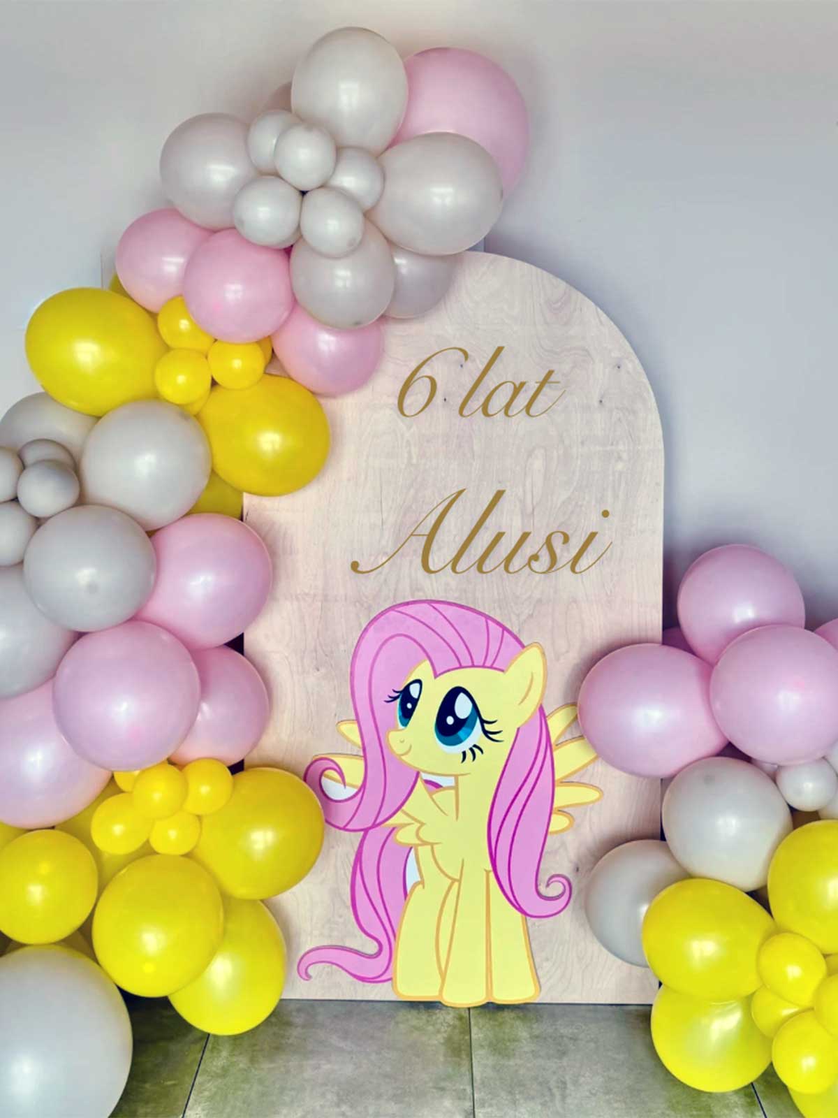 W zestawie: dwie ścianki (np. łukowa + łukowa frezowana w różnych wysokościach), girlanda balonowa, postument na tort, możliwość personalizacji (napis, nadruk, motyw bajkowy).