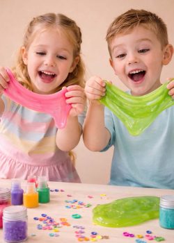 Każdy uczestnik tworzy własnego slime’a – miękkiego, ciągnącego się i kolorowego. Dzieci wybierają kolor i obserwują, jak płyn stopniowo zamienia się w elastyczną masę. Slime trafia do pojemniczka i wraca z dzieckiem do domu.