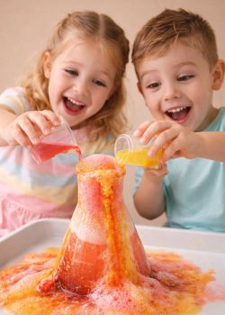 Dzieci wspólnie uruchamiają kolorowy wulkan z sody i octu, obserwując burzliwą reakcję chemiczną, pianę oraz „lawę” wypływającą z krateru. Eksperyment pobudza ciekawość, zachwyca i w prosty sposób pokazuje, że nauka może być fascynująca.